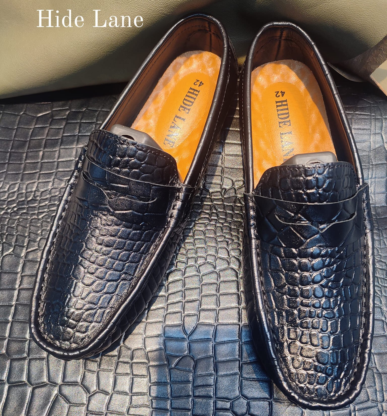 অরিজিনাল ক্রোকোডাইল টেক্সচার্ড লেদার প্রিমিয়াম লোফার। ফুল ব্ল্যাক প্রিমিয়াম লেদার।